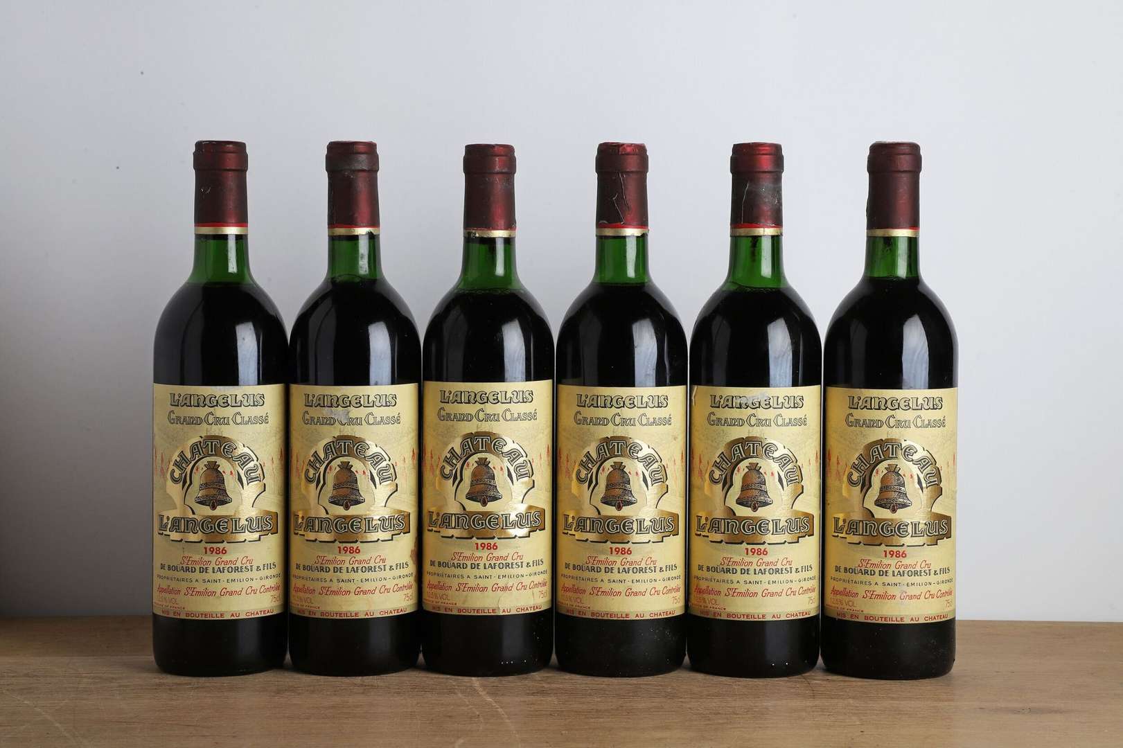 6 B CHÂTEAU ANGÉLUS (1 T.L.B.+| 2 T.L.B. et 3 H.E.+| 2 e.a| 3 c.a. bas de jupes| sur capsules négoce) - 1986 - GCC1A Saint-Emilion