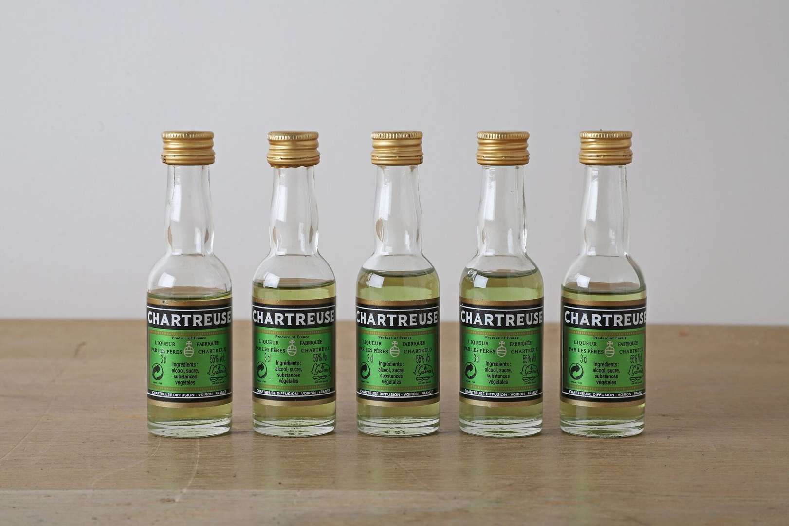 LOTS DE 5 MIGNONETTES CHARTREUSE VERTE 3 cl 55% - NM - Pères Chartreux